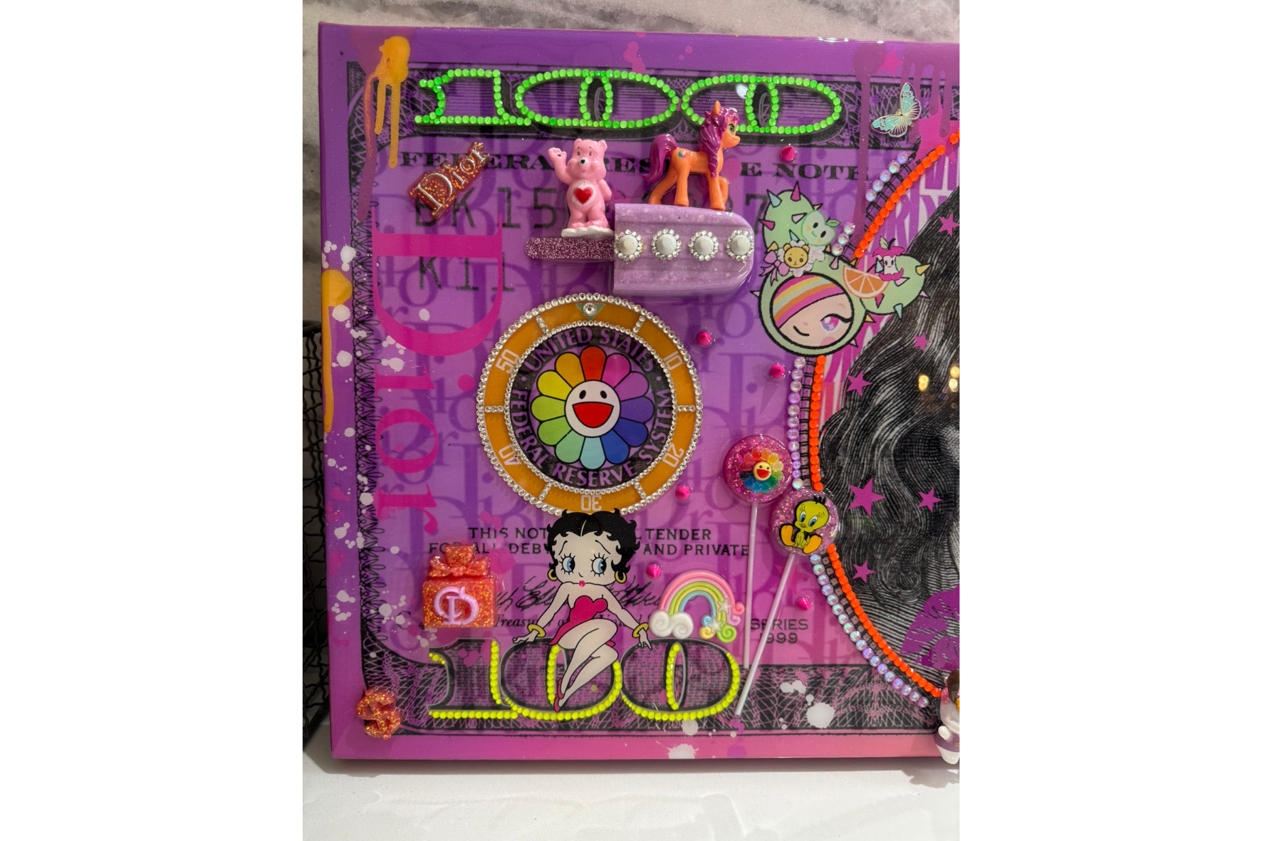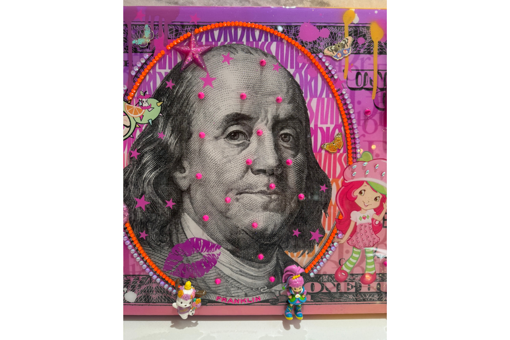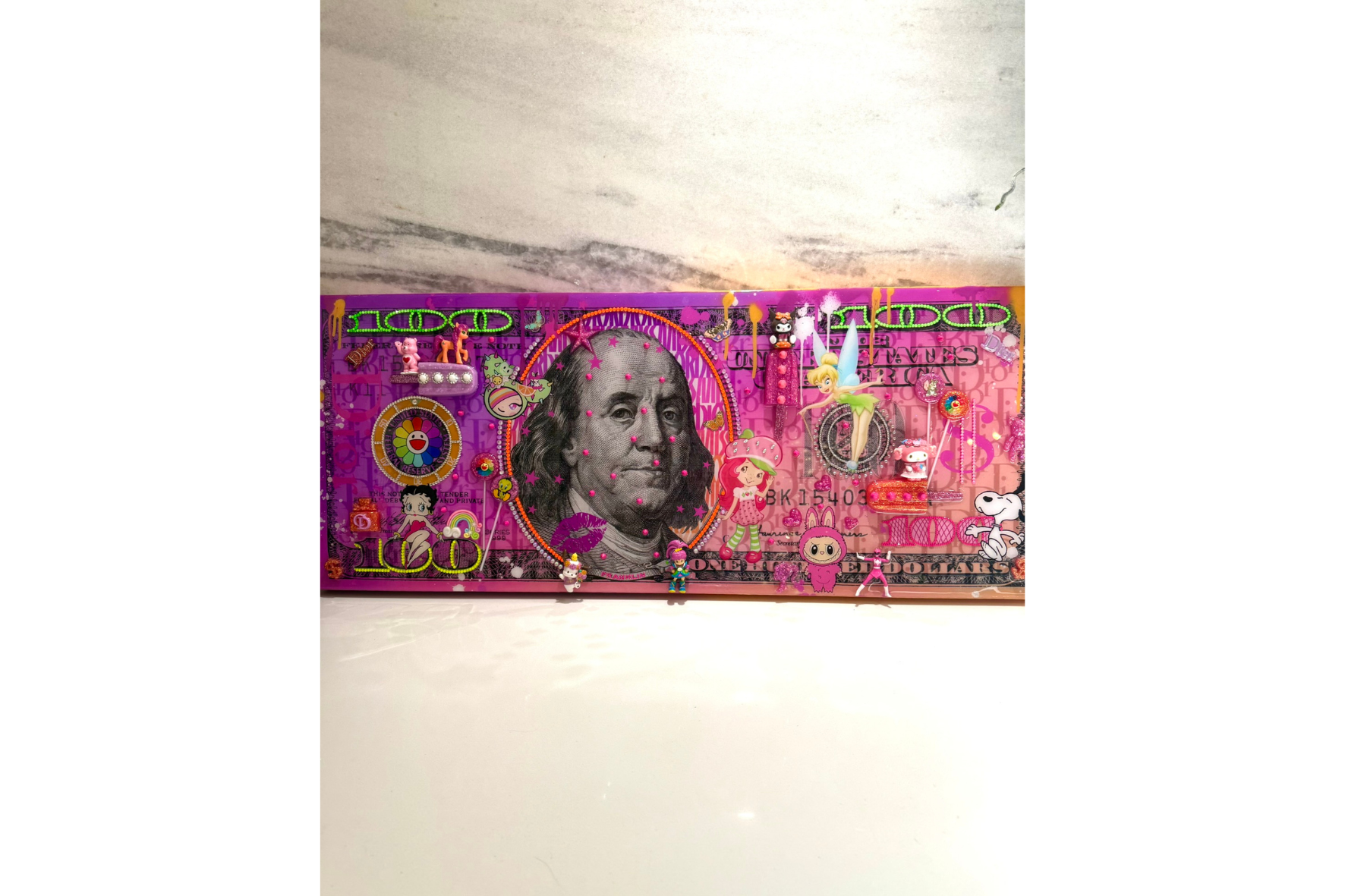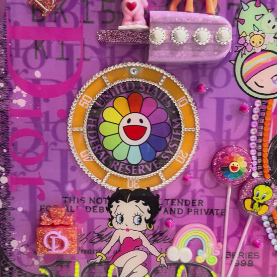 Benny and the Tunes is a vibrant mixed-media artwork that reimagines a hundred-dollar bill as a playful pop fantasy. Centered on a reworked portrait of Benjamin Franklin, the composition is energized by bold pink tones, neon accents, and layered pop-inspired imagery that creates a lively, music-driven visual rhythm.
