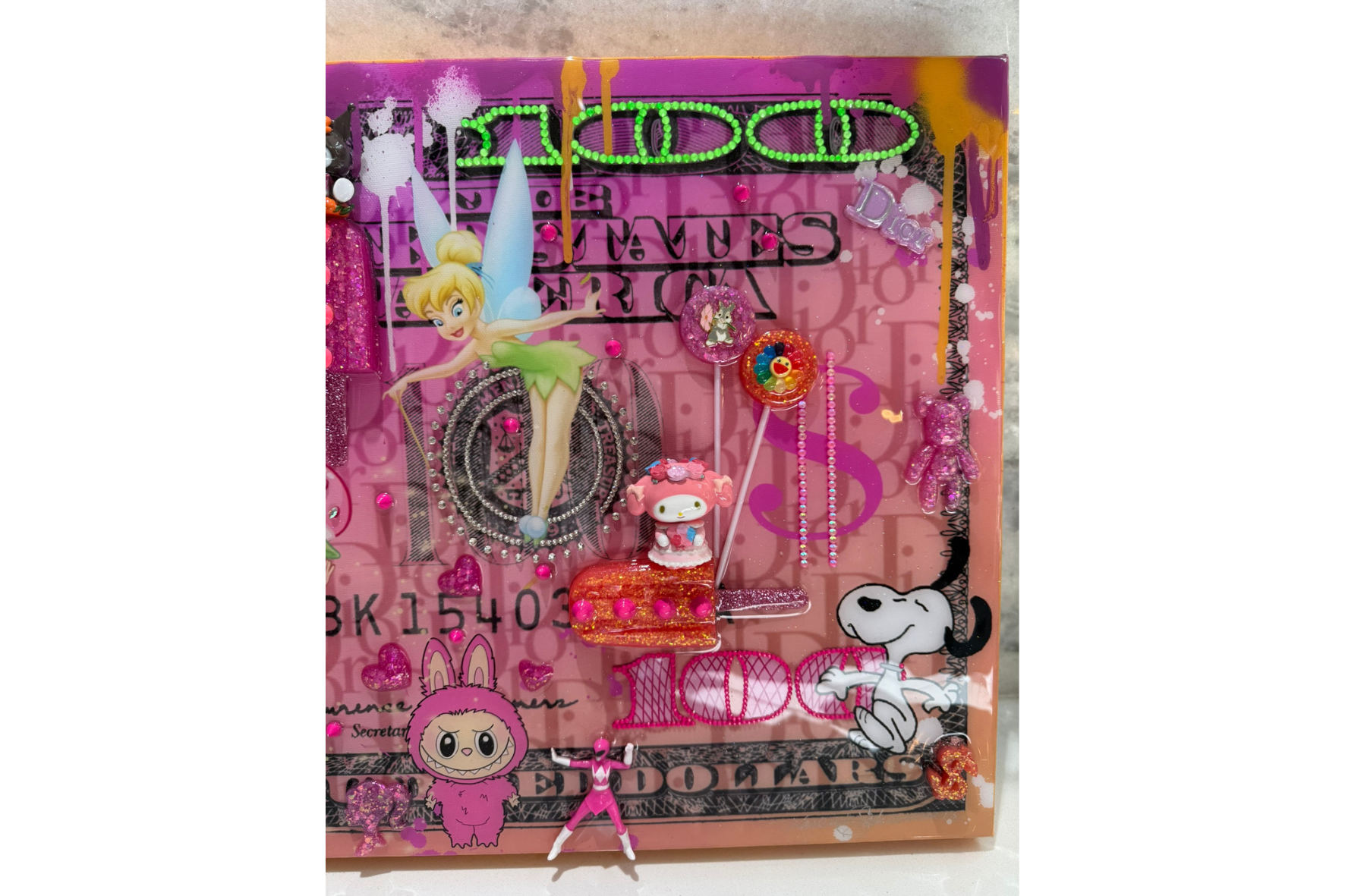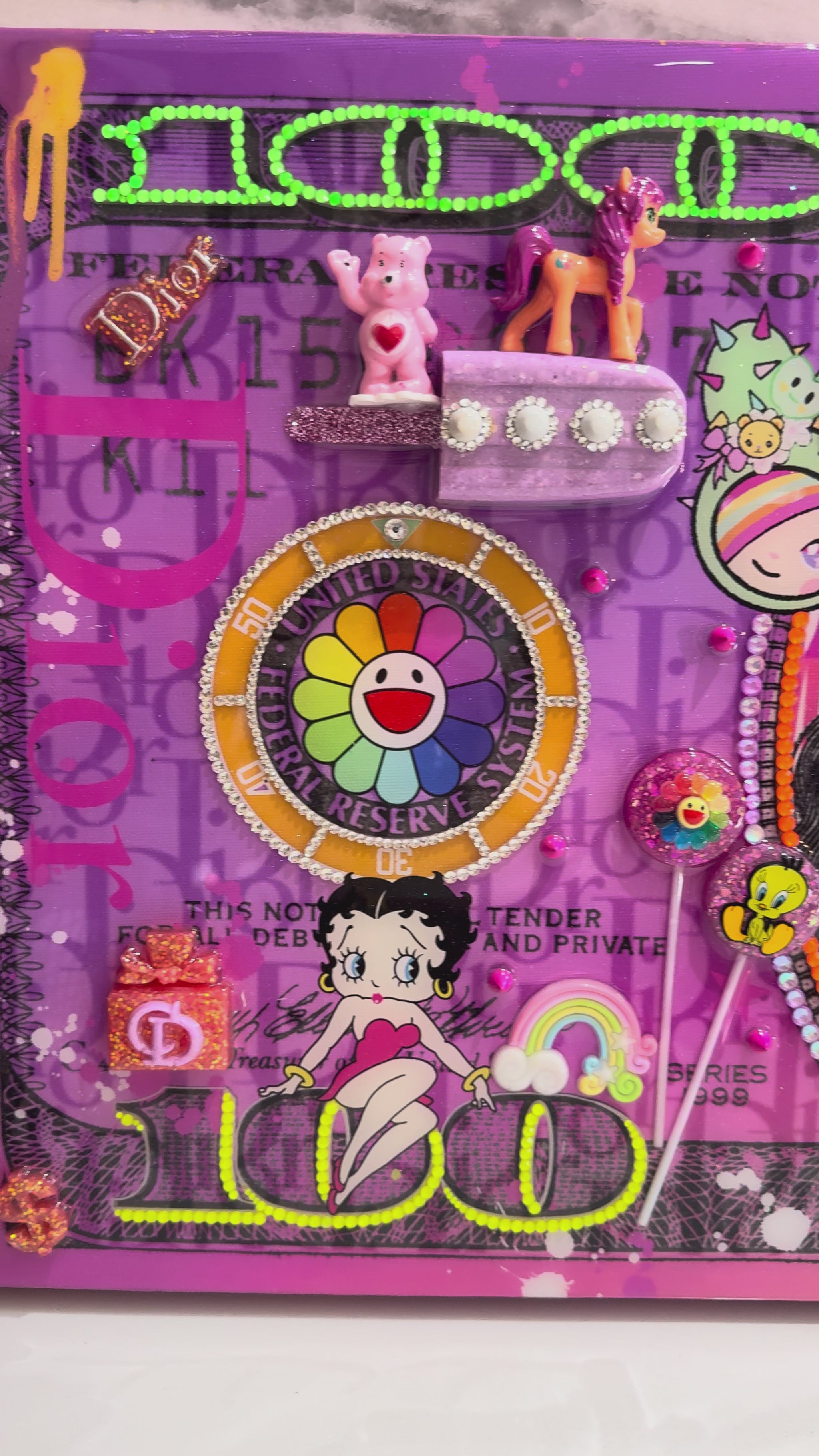 Blending street-art energy with pop and kawaii influences, the piece balances bold graphic design with meticulous hand-applied detailing. Sculptural elements, rhinestone accents, and a high-gloss resin finish add depth and dimension, inviting viewers to explore the surface and uncover new details over time.