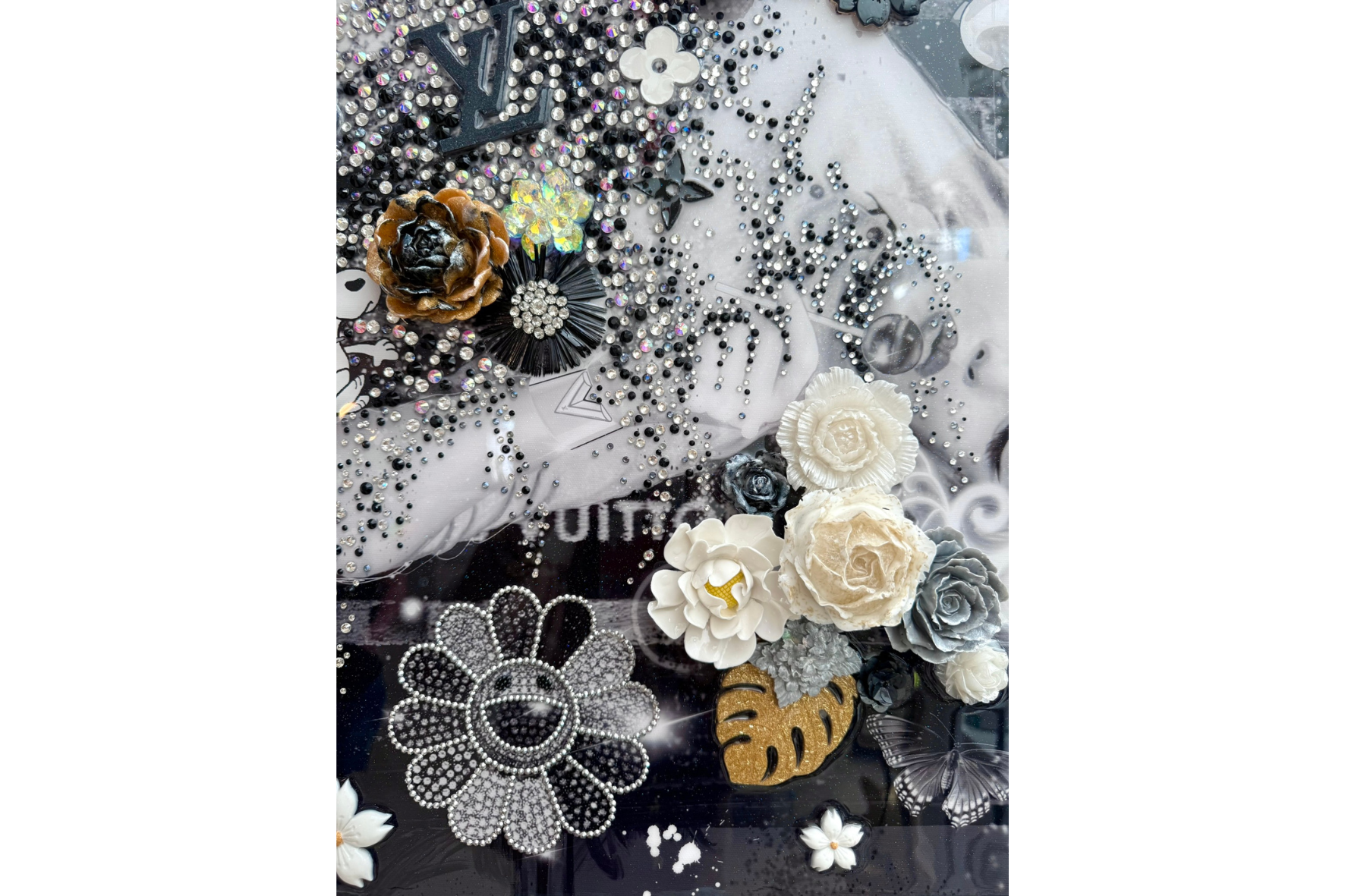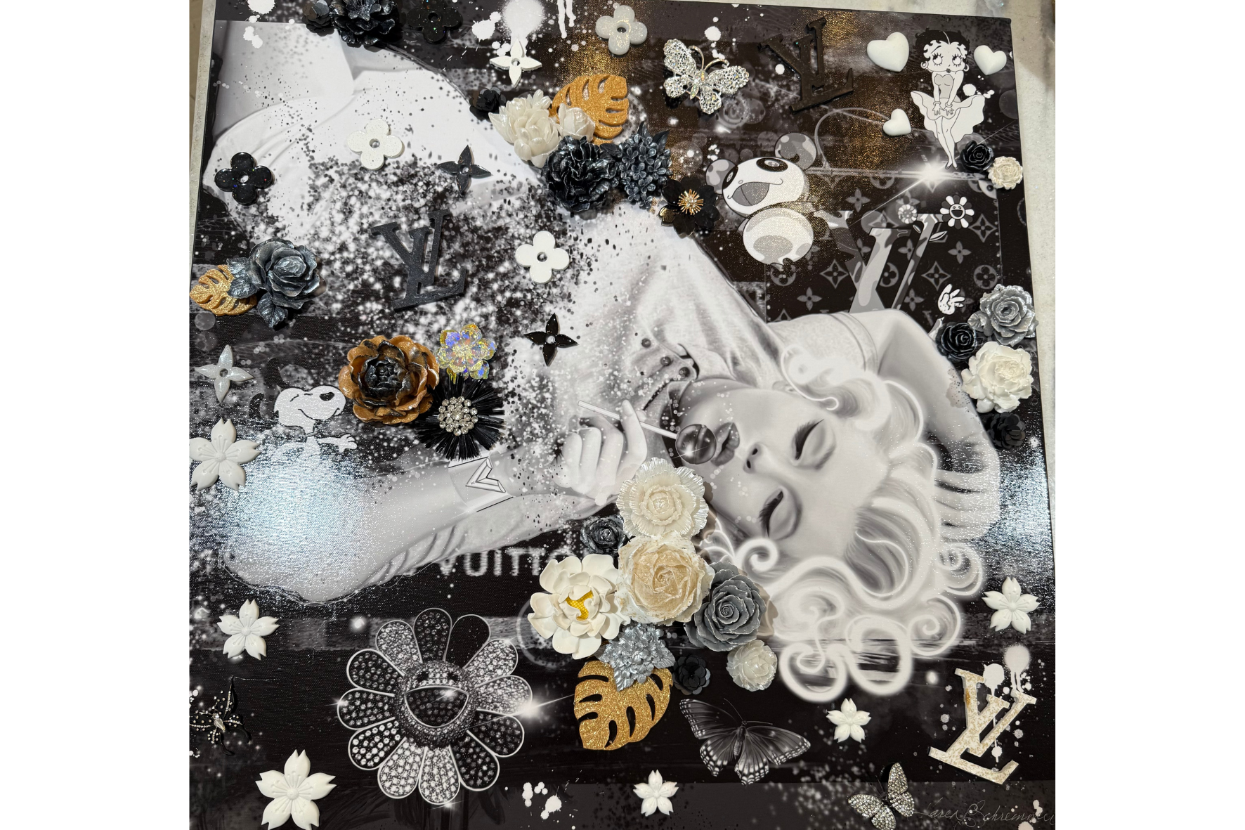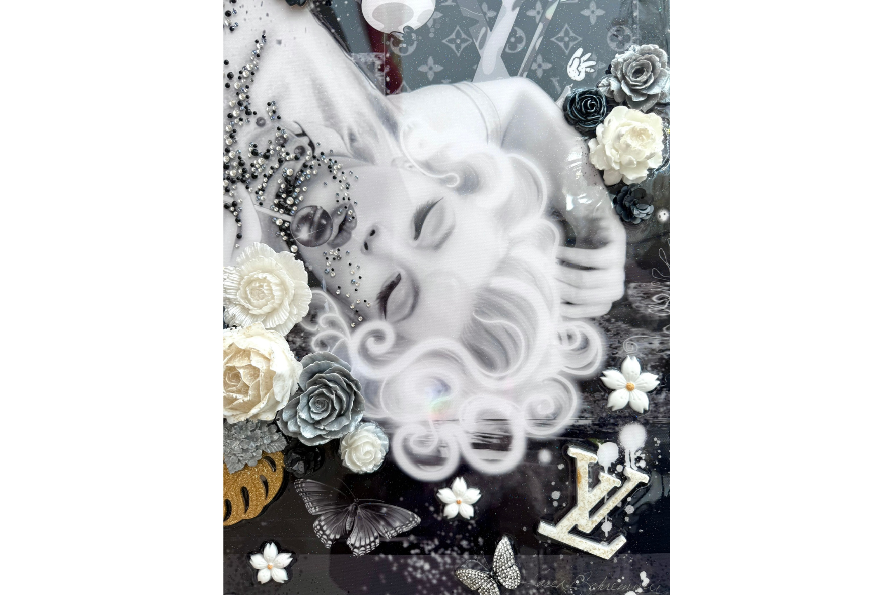 Marilyn Monroe is a luxurious, feminine mixed-media artwork celebrating elegance and iconic beauty. Layered digital and hand-painted details combine with sculptural molded elements - flowers, leaves, butterflies, and a Louis Vuitton motif - accented with sparkling crystal rhinestones. The glossy resin finish enhances depth and texture, creating a radiant, collectible piece perfect for contemporary interiors and collectors who appreciate sophisticated, glamorous art.