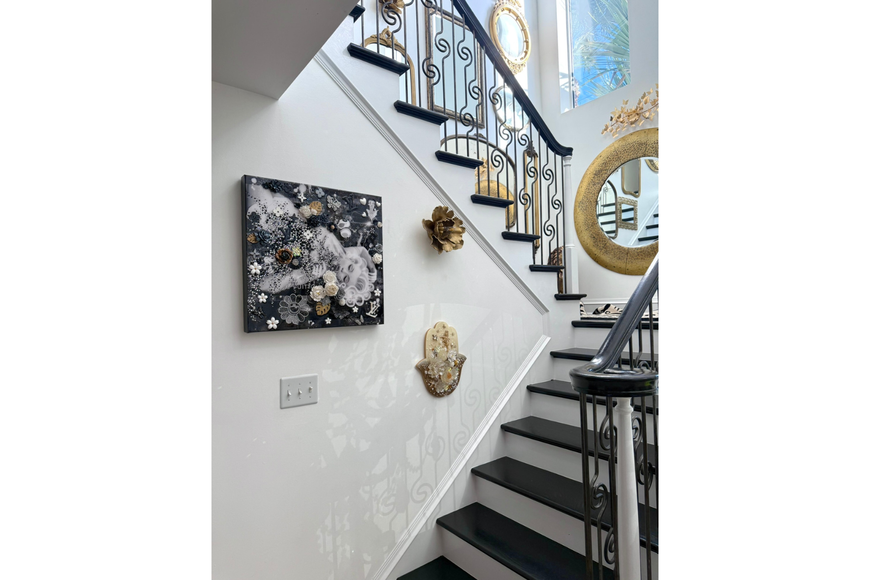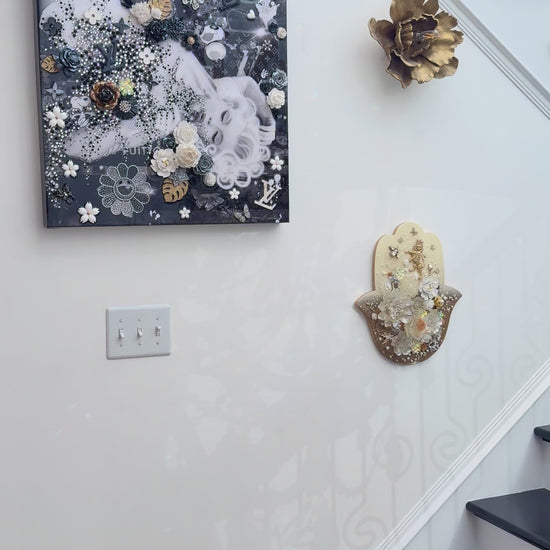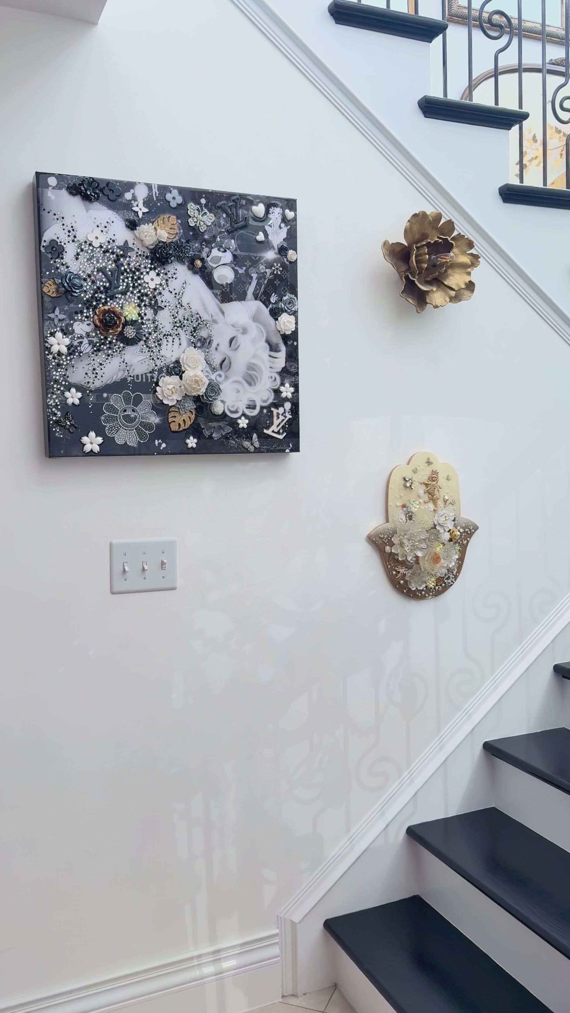 Marilyn Monroe is a luxurious, feminine mixed-media artwork celebrating elegance and iconic beauty. Layered digital and hand-painted details combine with sculptural molded elements - flowers, leaves, butterflies, and a Louis Vuitton motif - accented with sparkling crystal rhinestones. The glossy resin finish enhances depth and texture, creating a radiant, collectible piece perfect for contemporary interiors and collectors who appreciate sophisticated, glamorous art.