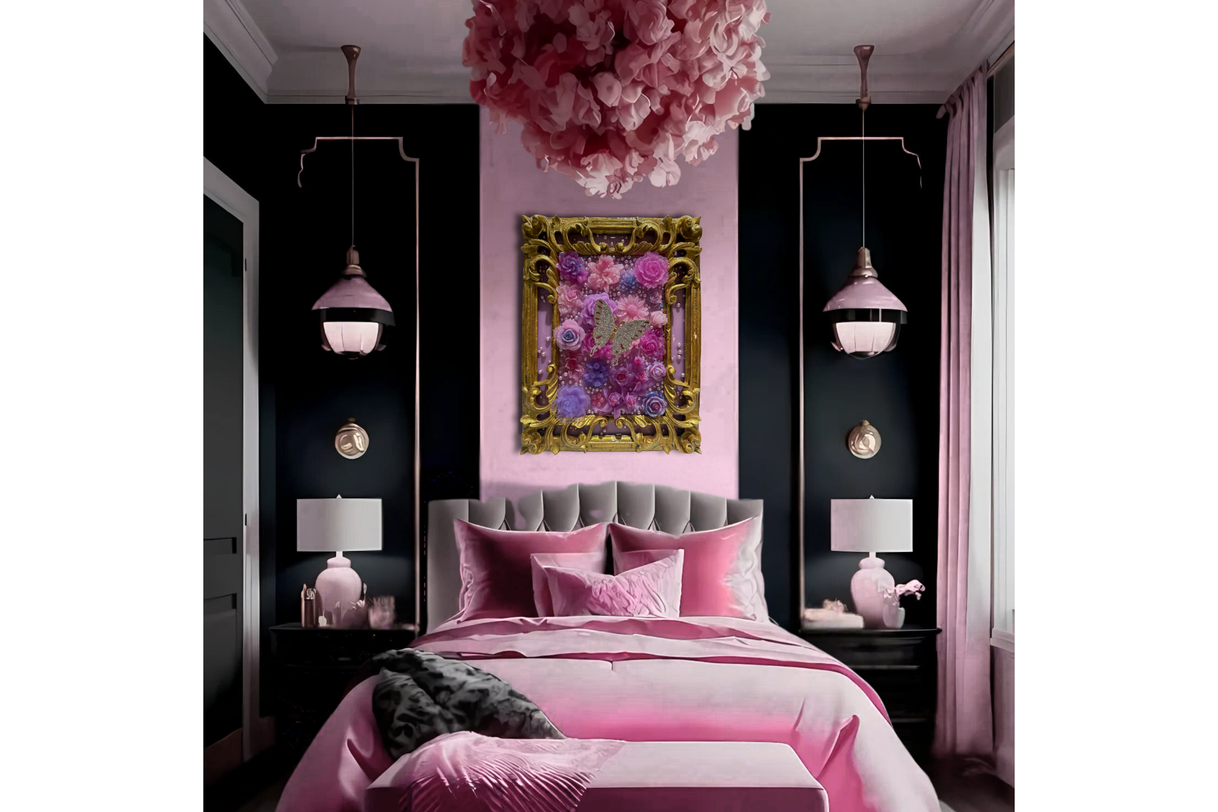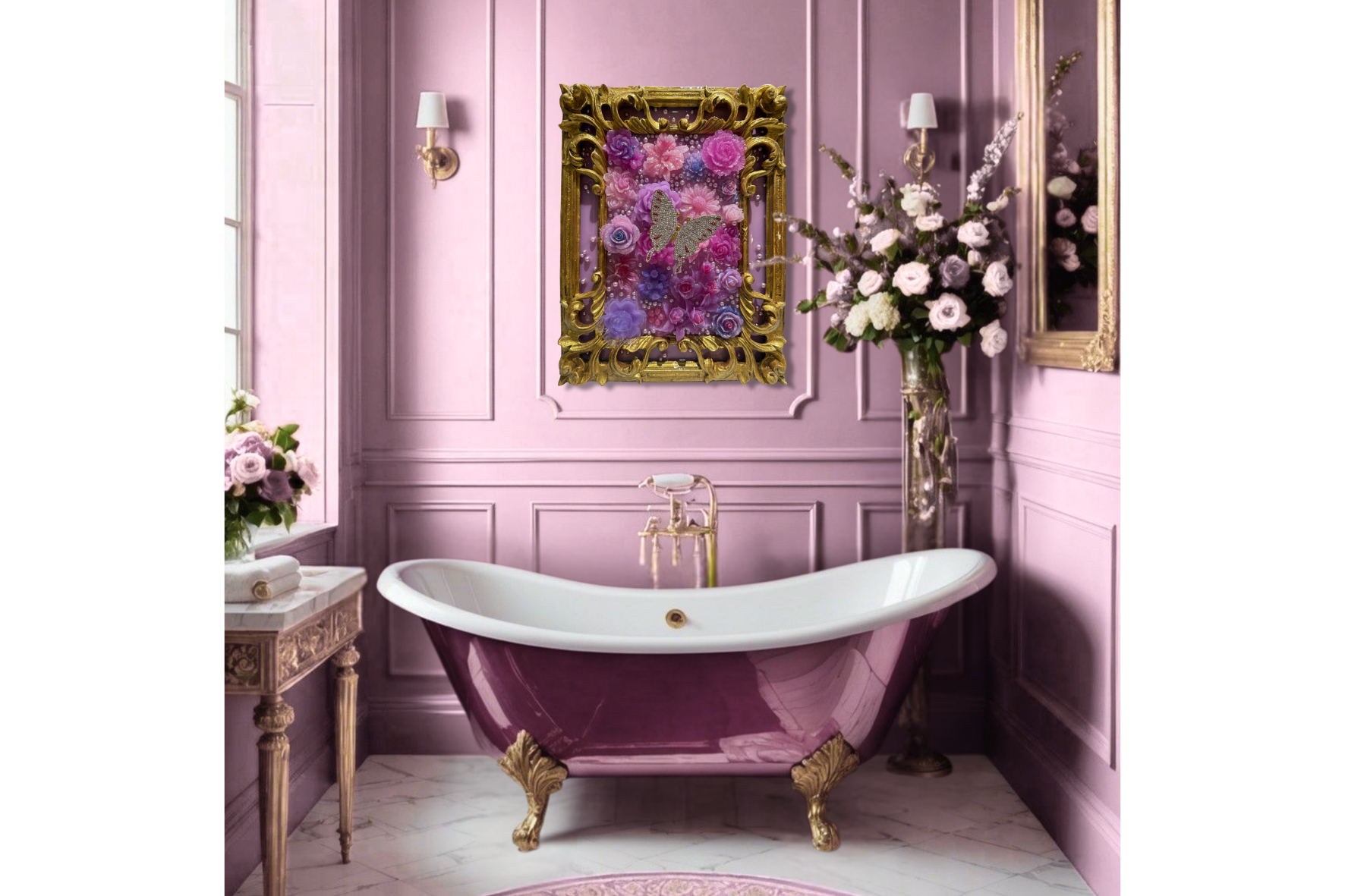 Butterfly on Flowers is a romantic and whimsical celebration of nature’s elegance, where sculptural blooms, radiant sparkle, and intricate detail come together in perfect harmony. At its heart, a shimmering rhinestone butterfly hovers gracefully above a lush garden of hand-sculpted flowers in luminous shades of pink, lavender, and violet. A lustrous, pearl-studded backdrop enhances the dreamy composition, while a beautifully restored antique frame adds timeless sophistication and vintage charm.