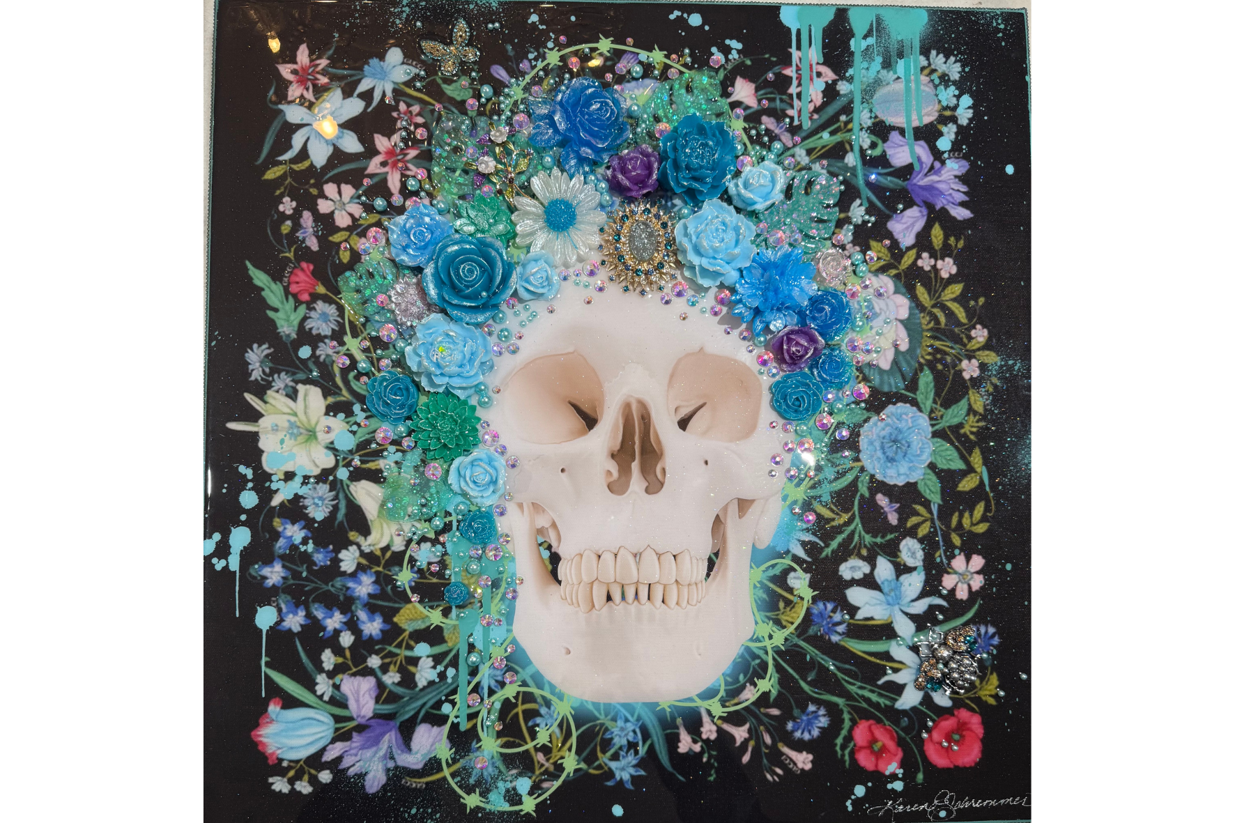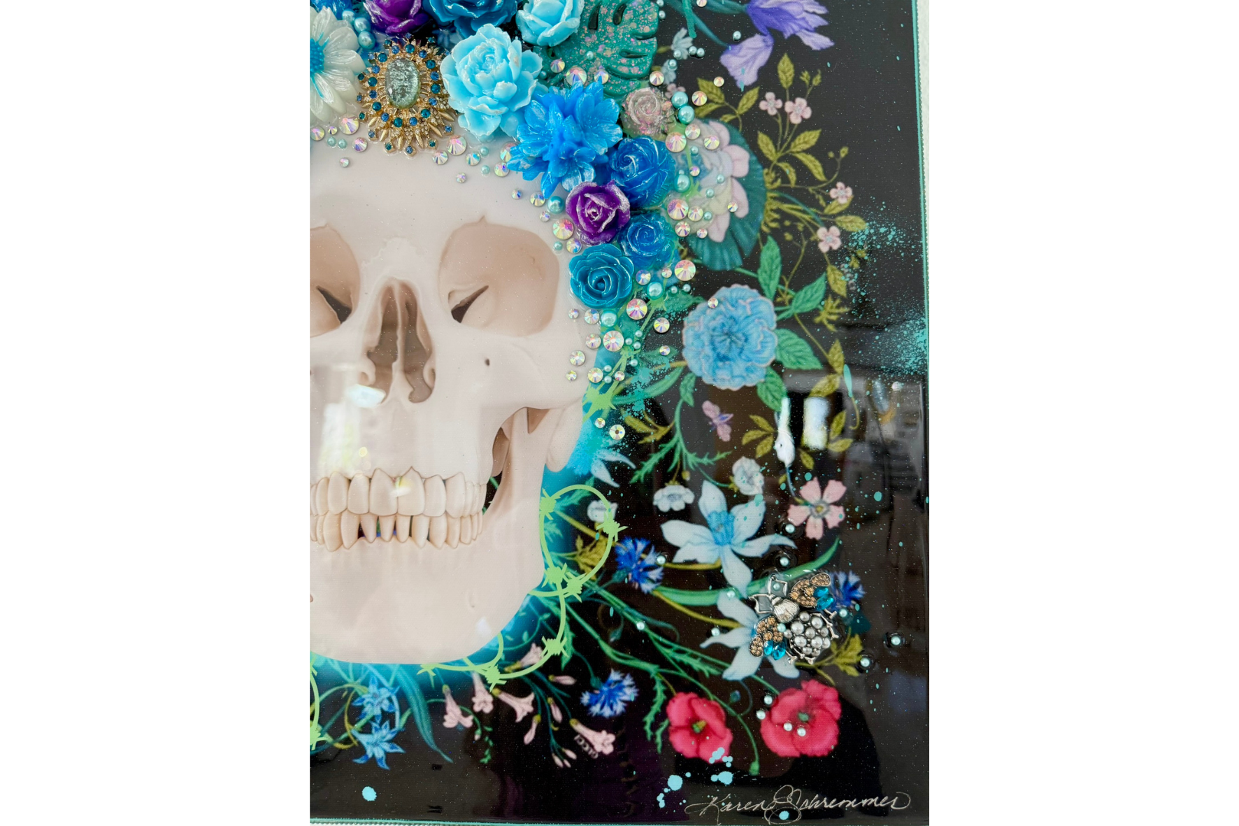 - Details - White skull with sculptural crown of molded flowers and butterfly elements, pearl and crystal rhinestone embellishments, and a black background featuring painted floral and leafy patterns