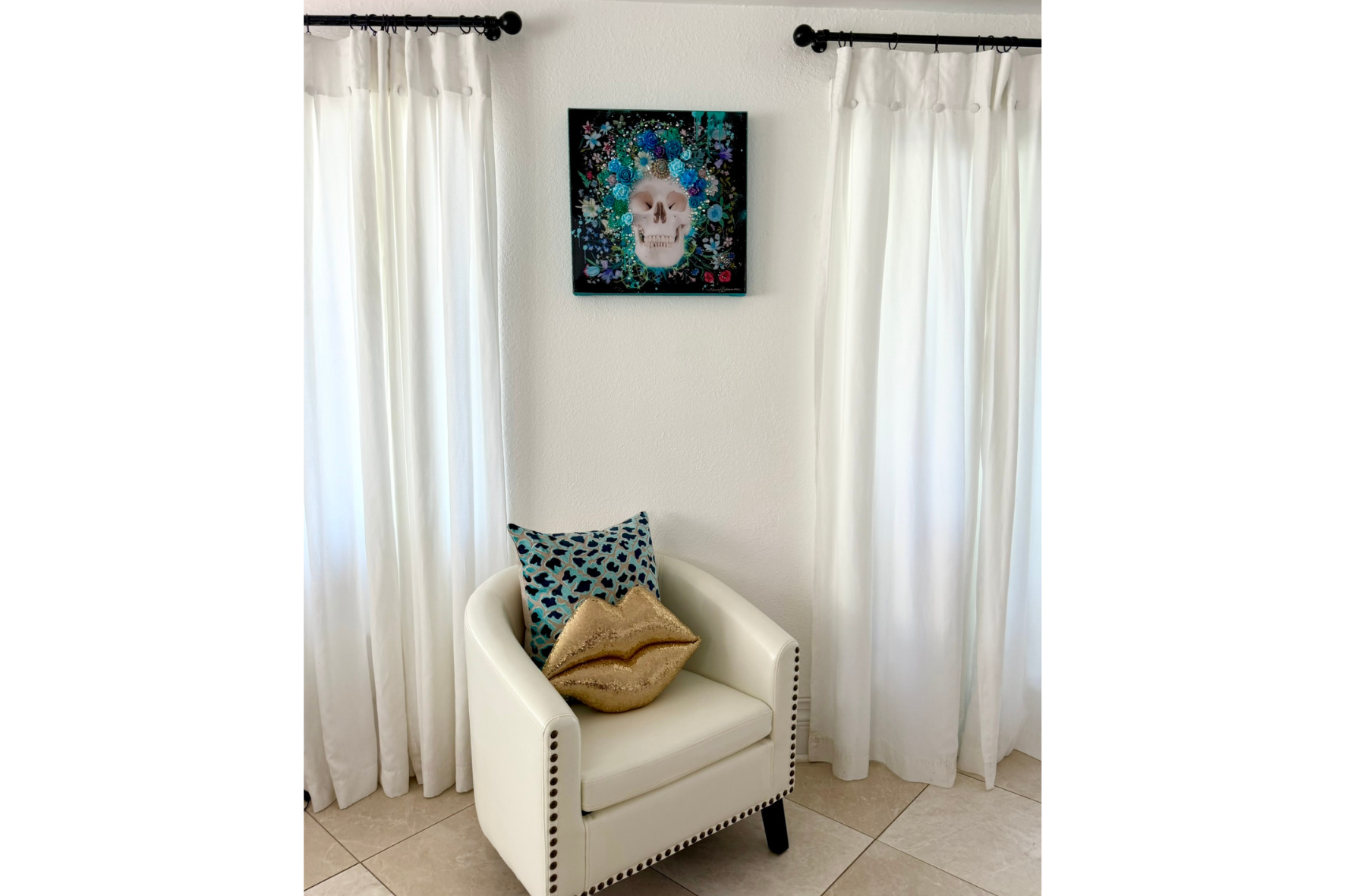 Gucci Skull in Teals blends luxury aesthetics with modern pop-art intensity, creating a striking focal piece defined by cool tones and rich ornamentation. The artwork’s bold contrast, jeweled textures, and sculptural elements give it a polished, high-fashion presence that stands out beautifully in any contemporary collection.