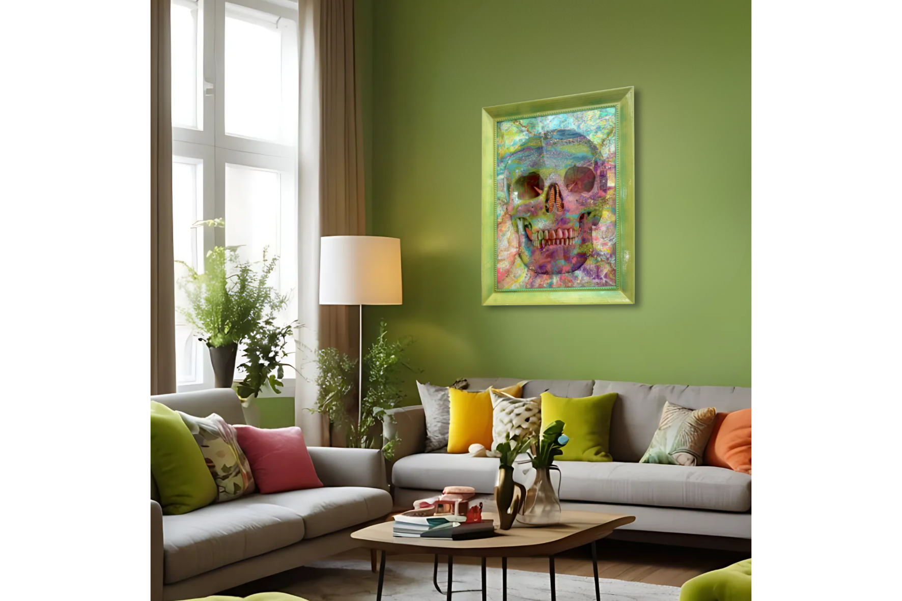 This striking mixed-media skull artwork glows with the luminous, color-shifting beauty of opal tones, accented by vivid greens and shimmering pastel highlights. Layers of iridescent textures catch the light from every angle, revealing flashes of pink, gold, and aqua that shift with movement, creating a mesmerizing and ever-changing visual experience.