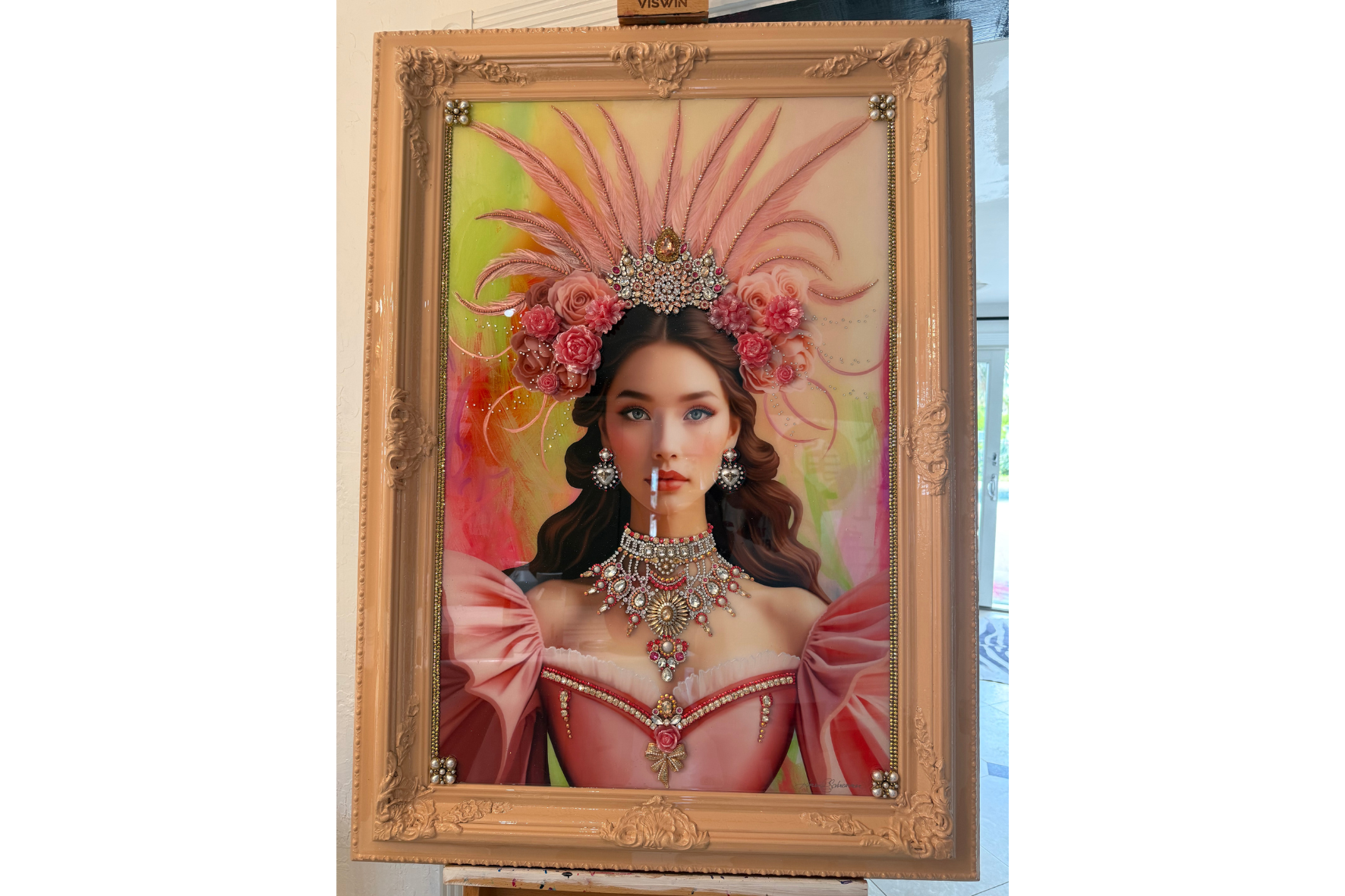 Runaway Nurse captures a soft, dreamy elegance centered around a beautiful woman adorned with a delicate feather headpiece. The artwork blends expressive color, refined textures, and shimmering highlights to create a gentle yet captivating presence. With its antique frame and luminous surface, the piece radiates femininity, charm, and timeless beauty - making it an unforgettable statement for any sophisticated collection.